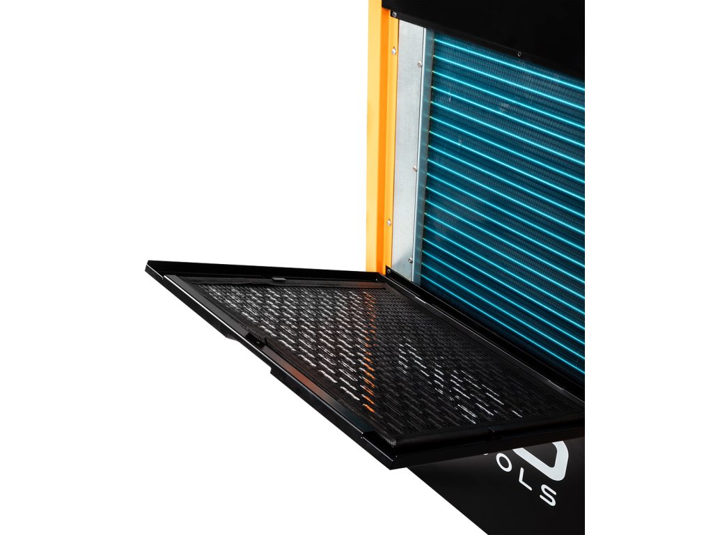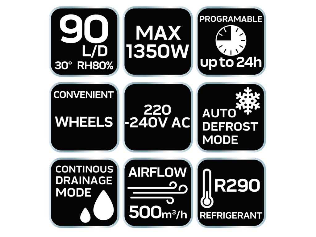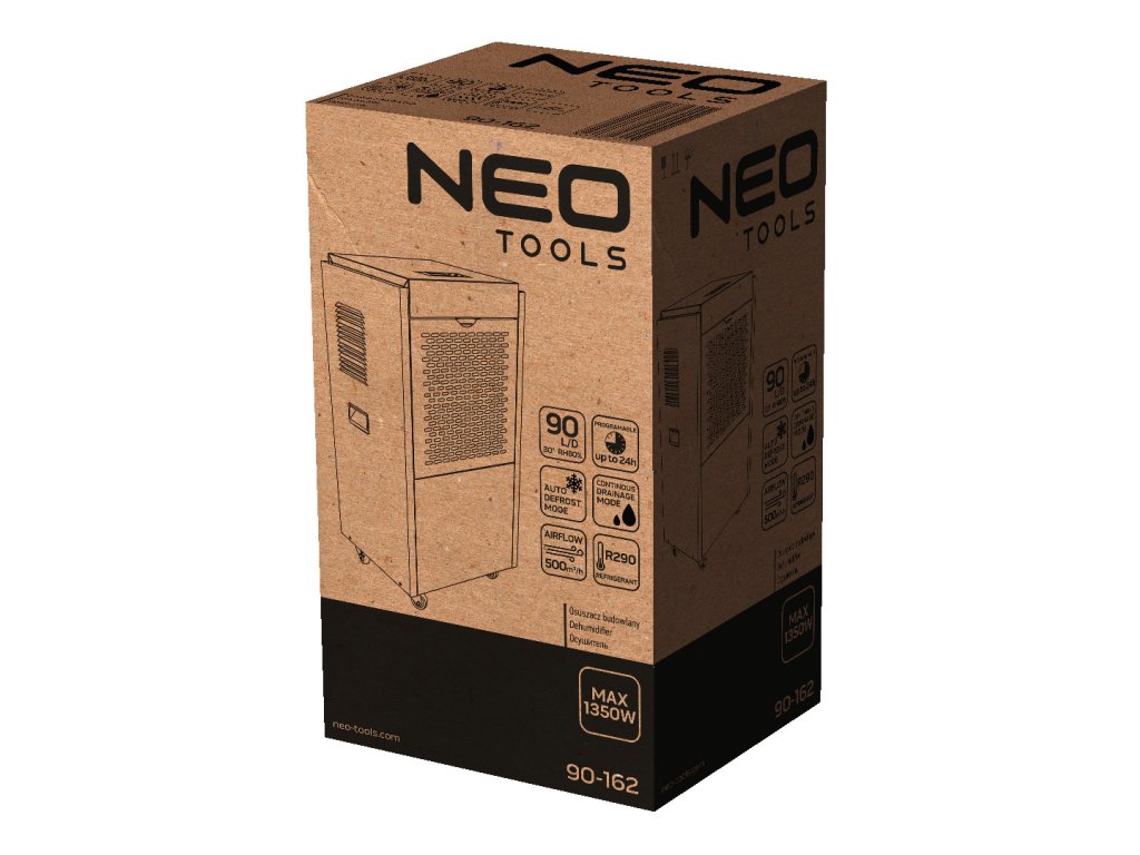 Stavební odvlhčovač 1000 W 90-162 od profesionální značky NEO je zařízení určené pro stavební a průmyslové činnosti, kde převládají náročné podmínky a vyžadují se viditelné rychlé výsledky. Odvlhčovač s výkonem 1000 W (max. 1350 W) a objemem 60 dB se vyznačuje odstraněním 90 litrů vlhkosti za den (30? a 80% relativní vlhkost). Zvládne průtok vzduchu 500 m²/h, má snadno čistitelný filtr a chladivo R290. Je vybavena praktickou funkcí automatického odmrazování a nepřetržitého odvádění vody (odtok vody přes gumovou trubici). Umožňuje naprogramovat až 24 hodin na LCD monitoru. Je vybaven pohodlnými kolečky a rukojetí pro snadnou přepravu. Odvlhčuje plochy do 310 m2. Funguje při teplotách od minimálně 5 do maximálně 35 stupňů Celsia. Stavební odvlhčovač se doporučuje pro odstraňování vody ze suterénů, užitkových prostor nebo stavenišť. Zabraňuje vzniku plísní a hub a odstraňuje následky záplav. Zařízení váží 48 kg a má rozměry 480 x 405 x 910 mm. Pro profesionální použití.