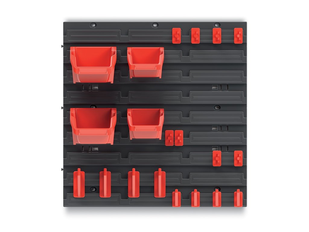 Praktická stěna na nářadí do dílny, servisu či garáže. Rozměry stěny 39,5 x 39,5 cm + 4 boxy a 16 držáků.