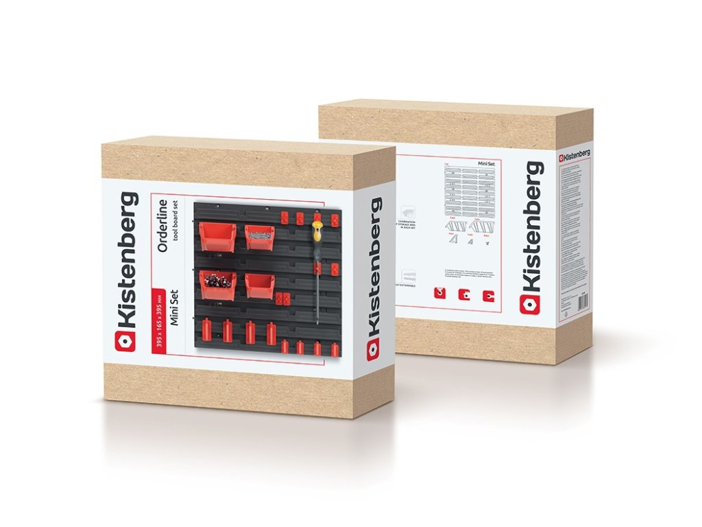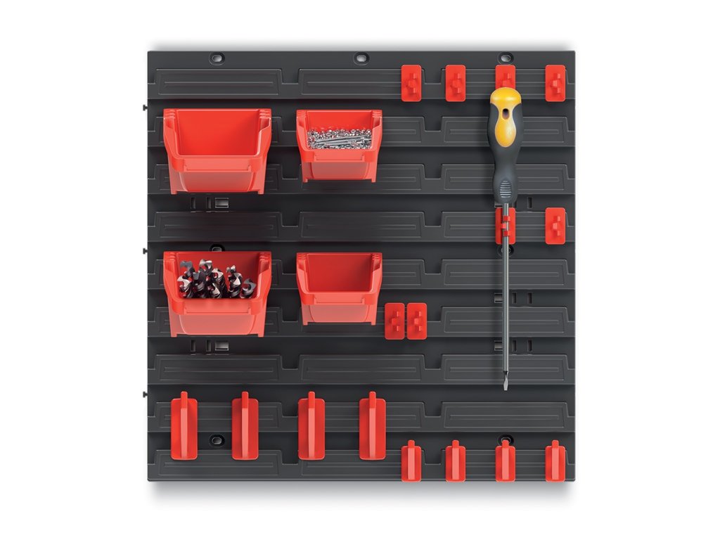 Stěna o rozměru 39,5 x 39,5 cm poskytne dostatek prostoru pro uložení potřebného nářadí, 4 přídavné boxy a 16 držáků poslouží jako úložný prostor pro nářadí, šrouby, hřebíky, matice nebo různé náhradní díly.