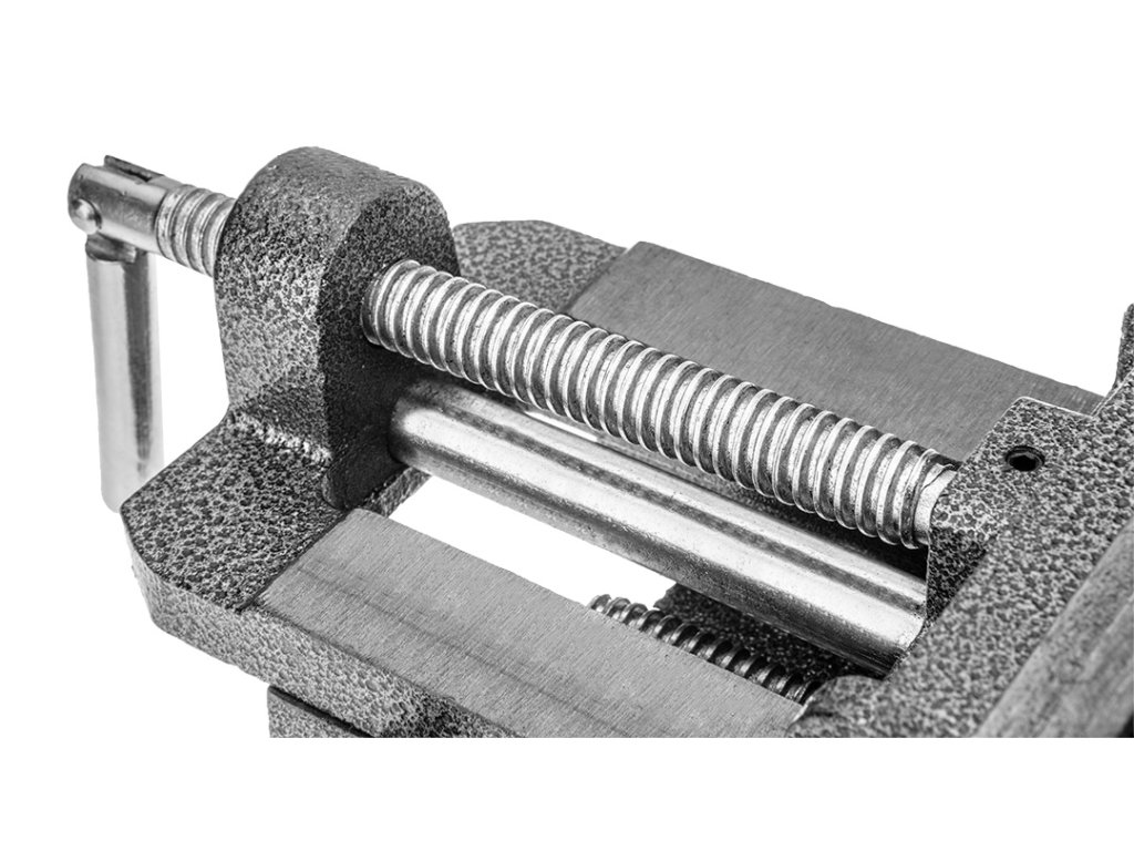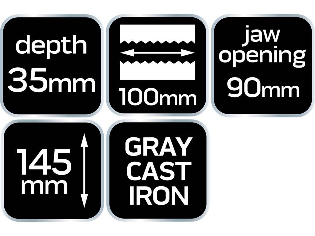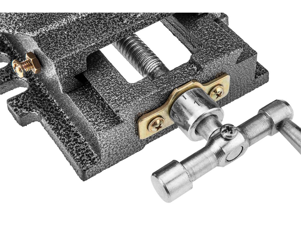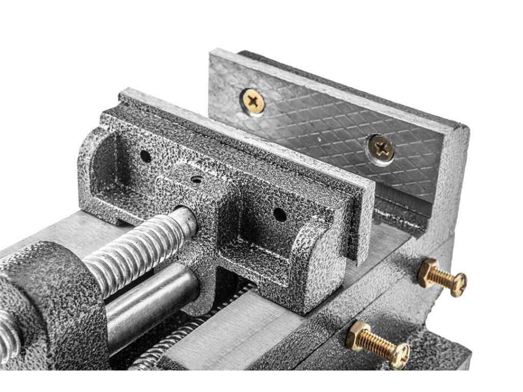 Dvouosý křížový svěrák NEO 35-035 o průměru 100 mm je kus s kovadlinou, jejíž tělo je vyrobeno z odolné litiny HT200, čelisti jsou kaleny z oceli 45# a rukojeť je vyrobena z vysoce kvalitní oceli Q235. Svěrák má šířku čelistí 100 mm, jeho otvor je 90 mm a hloubka hrdla čelistí je 35 mm. Komponenta má výšku 145 mm. Čelisti tohoto svěráku se mohou pohybovat horizontálně i vertikálně. Přesná obsluha a možnost nastavení polohy obrobku přispívají k pracovnímu komfortu. Svěrák se vyznačuje vysokou upínací silou na předměty a šroubovací tyčí se závitem ve tvaru T. Je to mimořádně odolný kus pro všechny druhy dílenských, hydraulických a jiných prací vyžadujících upínání obrobků.