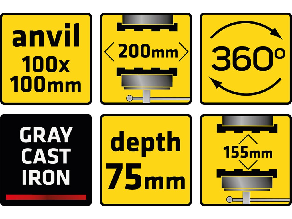 Otočný zámečnický svěrák TOPEX 07A220 200 mm se nabízí s kovadlinou 100 x 100 mm a 360stupňovou otočnou hlavou. Základna svěráku je vyrobena z odolné tvárné litiny odolné vůči poškození, tělo je z šedé litiny a čelisti jsou vyrobeny z kalené oceli. Nástroj má konstrukci odolnou vůči poškození. Čelisťové železo si zachovává svoji odolnost i po tepelném zpracování a šroubovací tyč ve tvaru T dále přispívá k pevnosti spojovacích prvků. Šířka čelistí je 200 mm, jejich otevření je 155 mm a hloubka hrdla čelistí je 75 mm. Rotační svěrák pro železáře se vyznačuje silným upínáním a upevňováním. Doporučuje se pro všechny druhy dílenských a hydraulických prací.