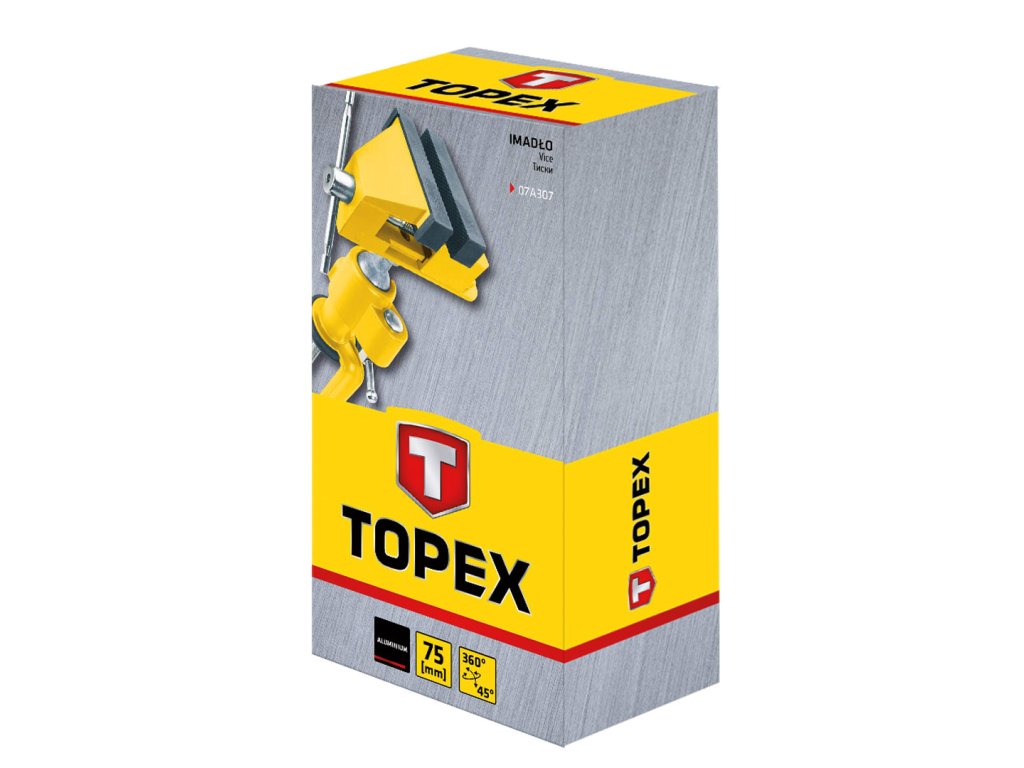 model svěráku TOPEX (ref. 07A307) s délkou čelistí 75 mm. Určeno pro upevňování předmětů a materiálů při přesných pracích. Výrobek je vyroben z hliníku a je odolný vůči korozi. K vysokému komfortu přispívá také upínací systém a kloub pro nastavení svěráku do pravého úhlu. Tlačítko rychlé aretace na upínacím šroubu umožňuje rychlé upnutí a uvolnění čelistí bez otáčení rukojeti. Značka TOPEX je určena pro domácí kutily.