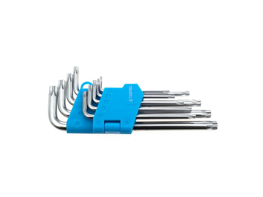 Sada klíčů Torx typ L s otvorem obsahuje 9 klíčů ve velikostech od T10 do T50, vyrobených z chrom-vanádové oceli.