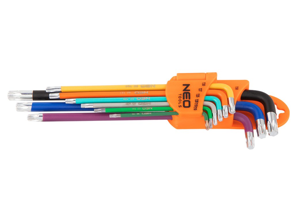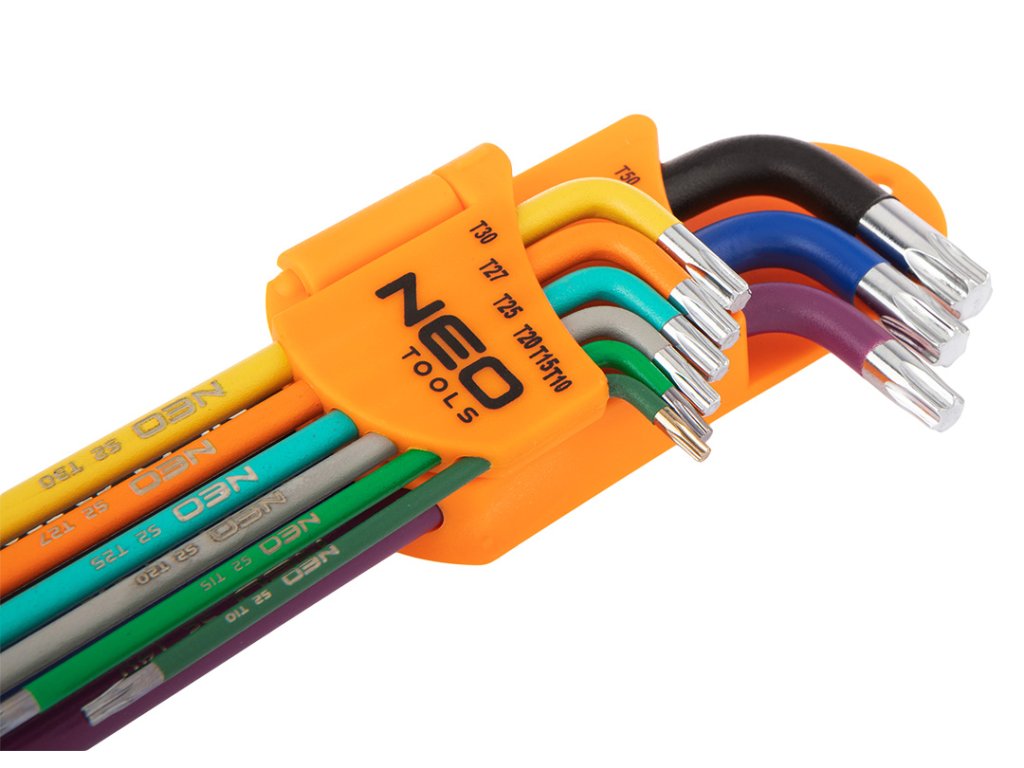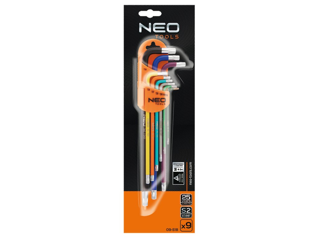 Sada klíčů NEO Torx (ref. 09-518) obsahuje 9 klíčů ve velikostech od T10 do T50. Vysoce kvalitní ocel S2 zaručuje dlouhodobou životnost. Každá velikost klíče je označena jinou barvou, což usnadňuje rychlý výběr vhodné velikosti během práce. Vše je zabaleno v praktické krabici. Spolehlivost výrobku potvrzuje 25letá záruka. Značka NEO splňuje očekávání profesionálů.