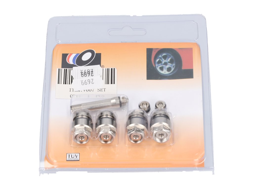 Sada kovových odnímatelných ventilů V007 určená pro kola osobních automobilů. Speciální konstrukce ventilů je chrání před ztrátou tlaku, manipulací, znečištěním a uvolněním.