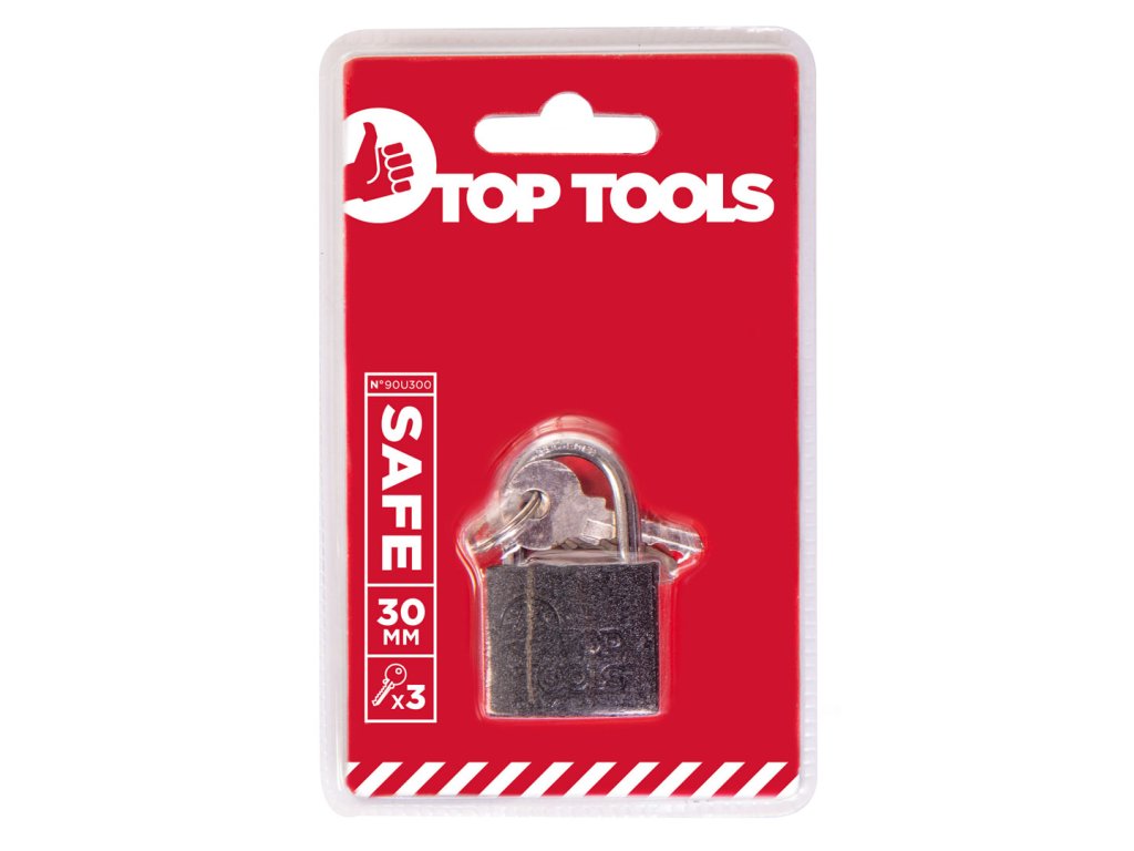 Visací zámek značky TOP TOOLS. Robustní zpracování zaručuje dlouhodobé používání bez ohledu na povětrnostní podmínky. Dodává se se 3 klíči