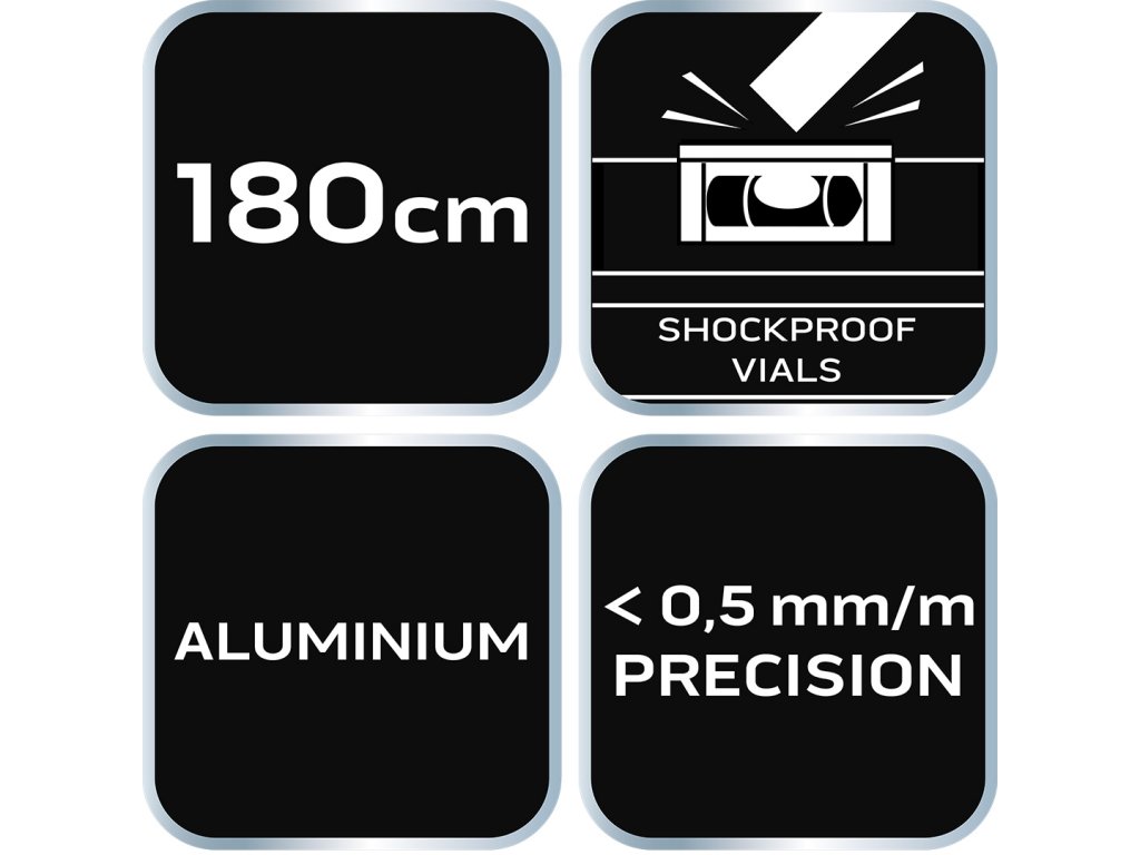 Hliníková vodováha S 300, 3 libely, 180 cm 71-137 od společnosti NEO je špičkový měřící přístroj se zabudovanými třemi trubkovými libelami (45, 90 a 180 stupňů), který využívá síly zemské gravitace k určení vodorovnosti nebo svislosti rovin. Nabízený model má rozměry 51,5×20,5×1800 mm. Má tloušťku profilu 1 mm. Přesnost vodováhy je stanovena na 0,029°=0,5 mm/m. Nástroj je vyroben z hliníku. Konstrukce je vybavena 2 krytkami proti nárazům. Doporučuje se pro profesionály a domácí kutily.