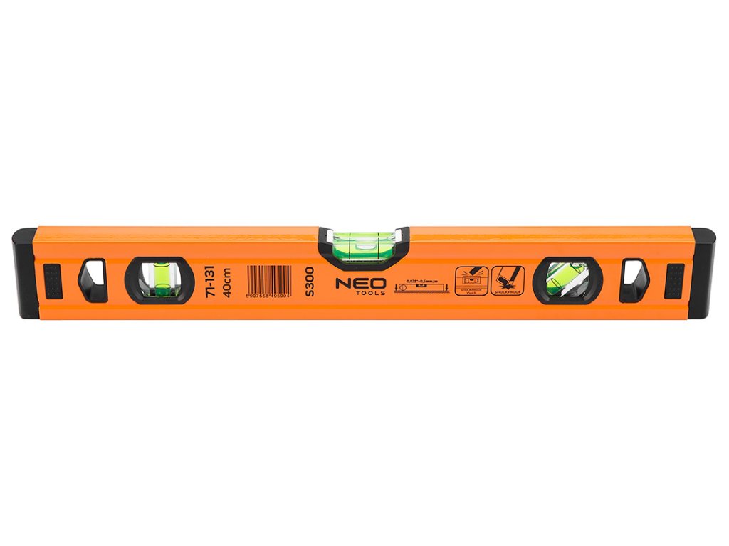 Hliníková vodováha S 300, 3 libely, 40 cm 71-131 od společnosti NEO je špičkový měřící přístroj se zabudovanými třemi trubkovými libelami (45, 90 a 180 stupňů), který využívá sílu zemské gravitace k určení vodorovnosti nebo svislosti rovin v konstrukci. Nabízený model má rozměry 51,5×20,5×400 mm. Má tloušťku profilu 1 mm. Přesnost vodováhy je stanovena na 0,029°=0,5 mm/m. Nástroj je vyroben z hliníku. Konstrukce je vybavena 2 krytkami proti nárazům. Doporučuje se pro profesionály a domácí kutily.
