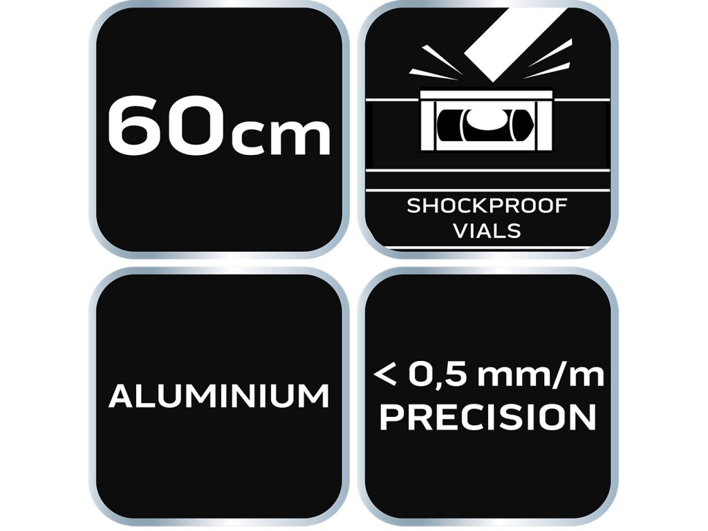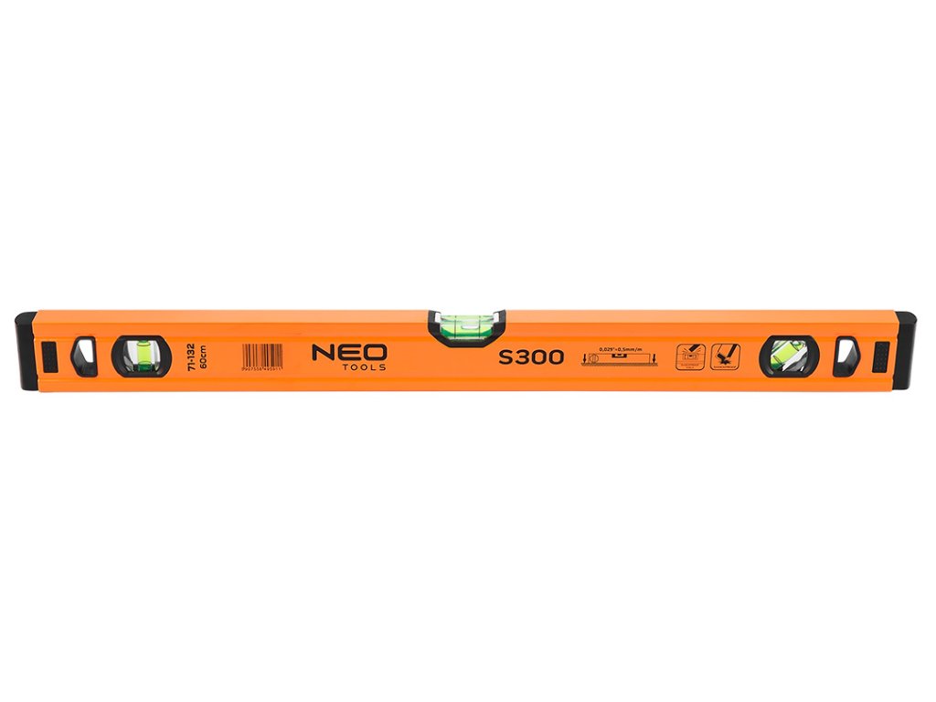 Hliníková vodováha S 300, 3 libely, 60 cm 71-132 od společnosti NEO je špičkový měřící přístroj se zabudovanými třemi trubkovými libelami (45, 90 a 180 stupňů), který využívá síly zemské gravitace k určení vodorovnosti nebo svislosti rovin v konstrukci. Nabízený model má rozměry 51,5×20,5×600 mm. Má tloušťku profilu 1 mm. Přesnost vodováhy je stanovena na 0,029°=0,5 mm/m. Nástroj je vyroben z hliníku. Konstrukce je vybavena 2 krytkami proti nárazům. Doporučuje se pro profesionály a domácí kutily.