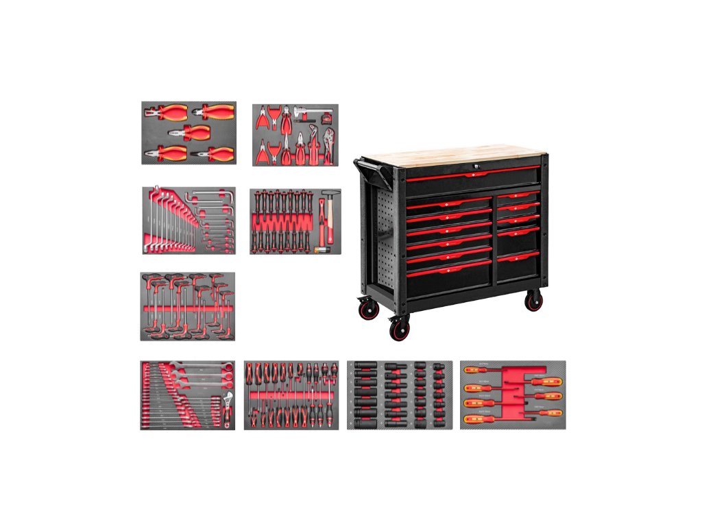 Profesionální dílenský vozík s 12 zásuvkami a 360ks nářadí, které jsou důkladně uloženy v pěnových vložkách. Vybaven je navíc dřevěnou pracovní deskou.