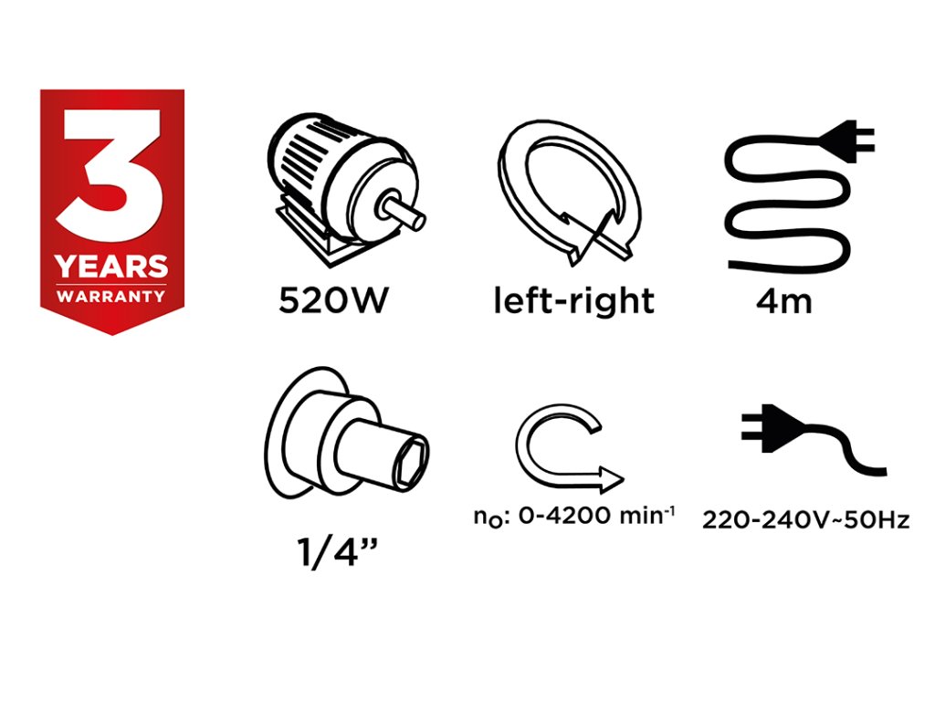 Šroubovák 520 W, otáčky 0-4200 otáček za minutu, ovládací rukojeť 1/4", (DxV) 275 x 190 mm, hmotnost 1,5 kg, napájecí kabel 4 m, kufr, příslušenství: magnetický držák, 5 ks. Bity