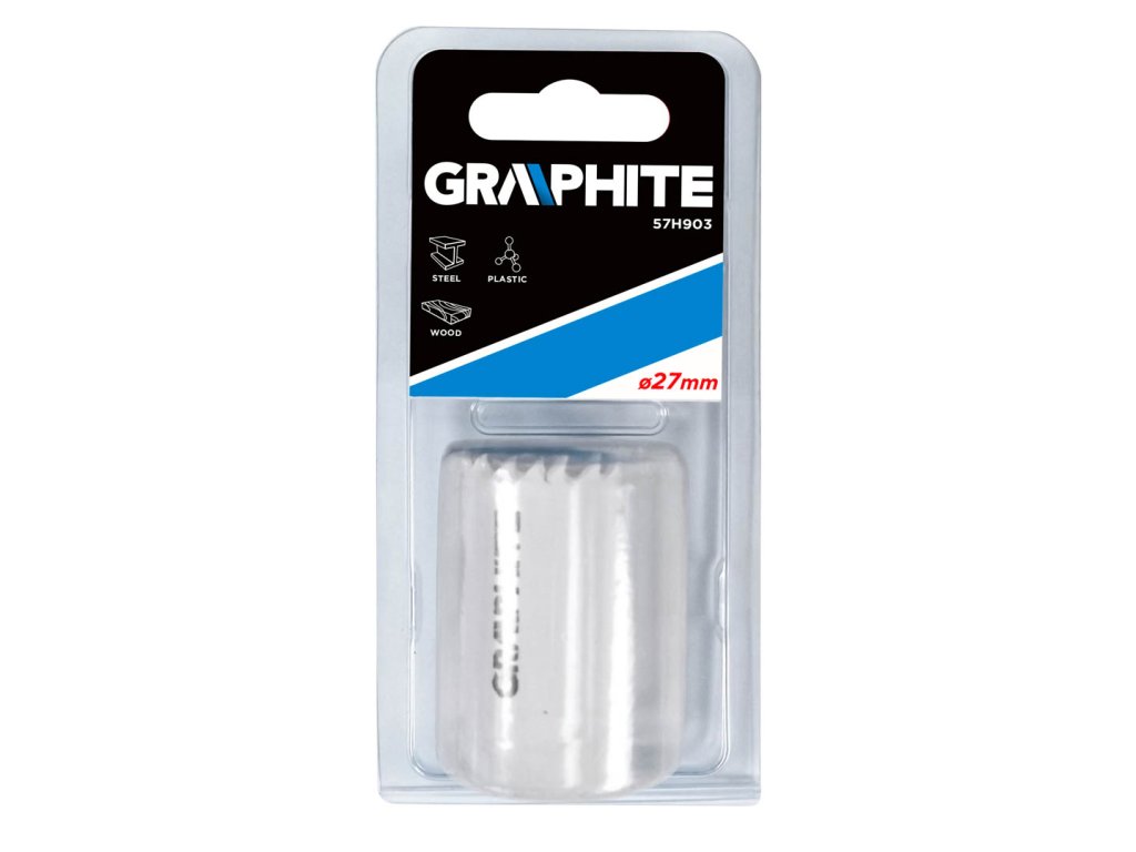 Bimetalový vykružovák GRAPHITE prostřednictvím progresivních zubů vyrobených z rychlořezné oceli umožňuje efektivní vrtání přesných otvorů v oceli, nerezové oceli, dřevě, plastech, kompozitních materiálech.