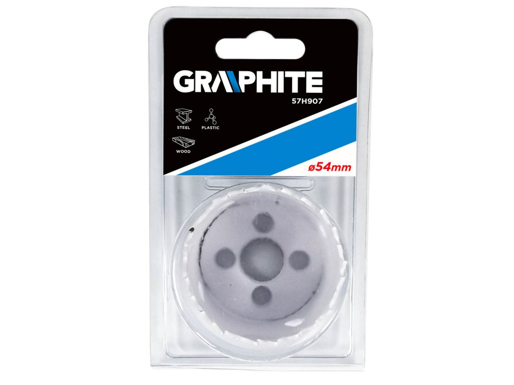 Bimetalový vykružovák GRAPHITE prostřednictvím progresivních zubů vyrobených z rychlořezné oceli umožňuje efektivní vrtání přesných otvorů v oceli, nerezové oceli, dřevě, plastech, kompozitních materiálech.