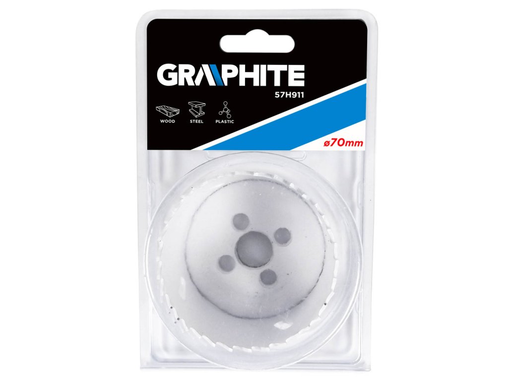 Bimetalový vykružovák GRAPHITE prostřednictvím progresivních zubů vyrobených z rychlořezné oceli umožňuje efektivní vrtání přesných otvorů v oceli, nerezové oceli, dřevě, plastech, kompozitních materiálech.