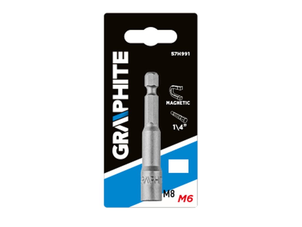 Magnetická objímka GRAPHITE (bez ref. Č. 57H991), o velikosti 6 mm, je určena pro samovrtné šrouby se šestihrannou hlavou velikosti 6 mm, vyrobena z vysoce odolné chromové oceli 50BV30. Silný magnet uložený v bronzovém pouzdře chrání šrouby před vypadnutím z objímky během počáteční fáze šroubování.