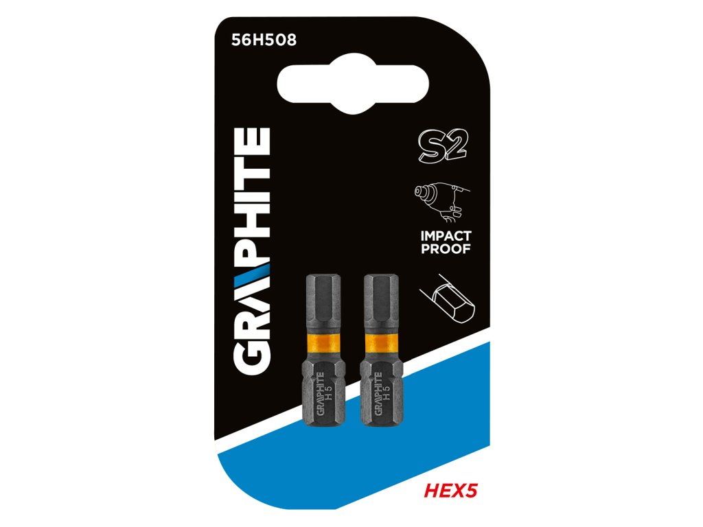 Rázové bity GRAPHITE (ref. 56H508) Typ HEX5, celková délka 25 mm, jsou robustní bity určené k použití při větších točivých momentech pomocí šroubováků nebo rázových utahováků. Vyrobeno z vysoce kvalitní oceli S2, která má zvýšenou pružnost a odolnost vůči mechanickému poškození. Torzní zóna, která se otáčí při vysokém kroutícím momentu, snižuje přenos síly, díky čemuž je vrták odolnější vůči zlomení a několikanásobně se prodlužuje jeho životnost. Pracovní konec bitu zaručuje dokonalé uchycení. Značka GRAPHITE nabízí široký sortiment elektrického nářadí, které splňuje potřeby profesionálů.