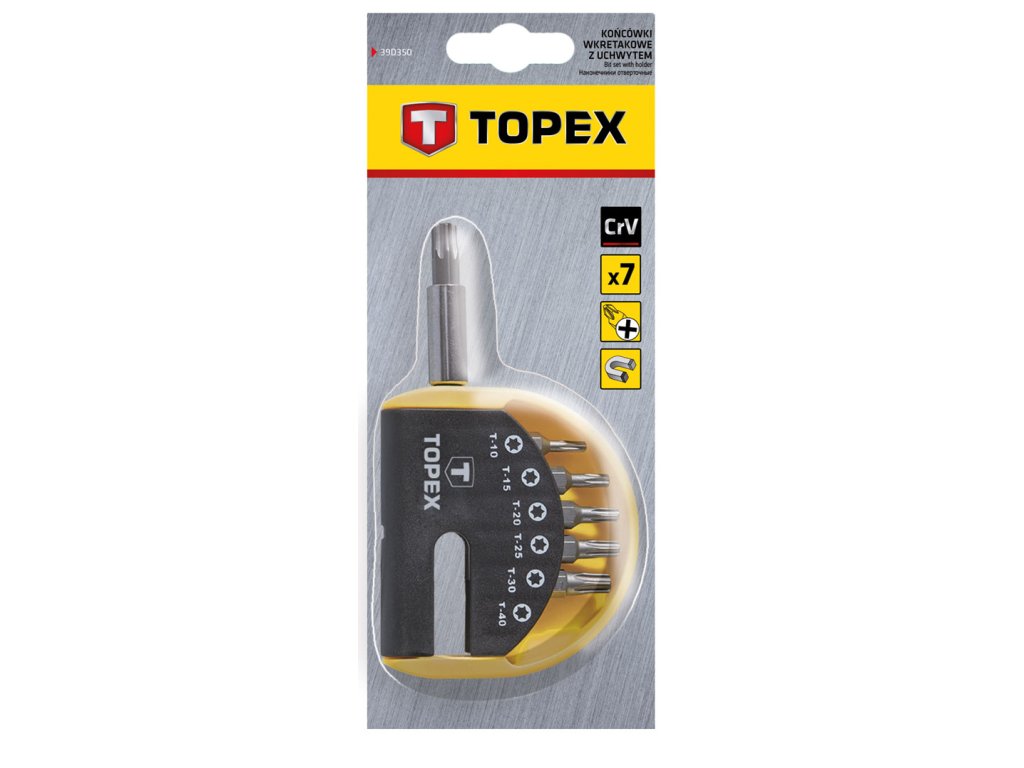 Sada šroubováků Torx s rukojetí (ref. 39D351) je inovativní řešení, kde organizér bitů slouží zároveň jako rukojeť. Všechny komponenty jsou vyrobeny z vysoce kvalitní chrom-vanadiové oceli, která zaručuje dlouhou životnost nástroje. Držák-organizér z plastu. Velice praktická souprava, snadno se přepravuje. Značka TOPEX je určena pro domácí kutily.