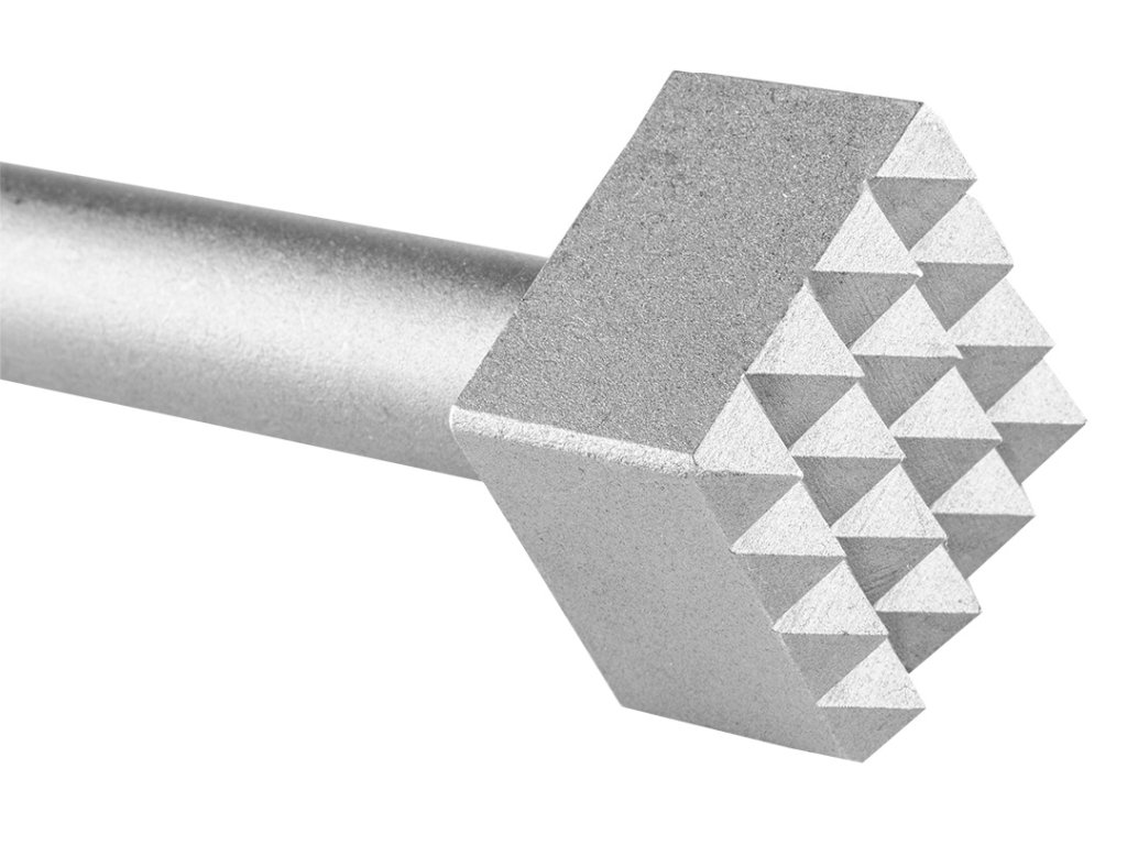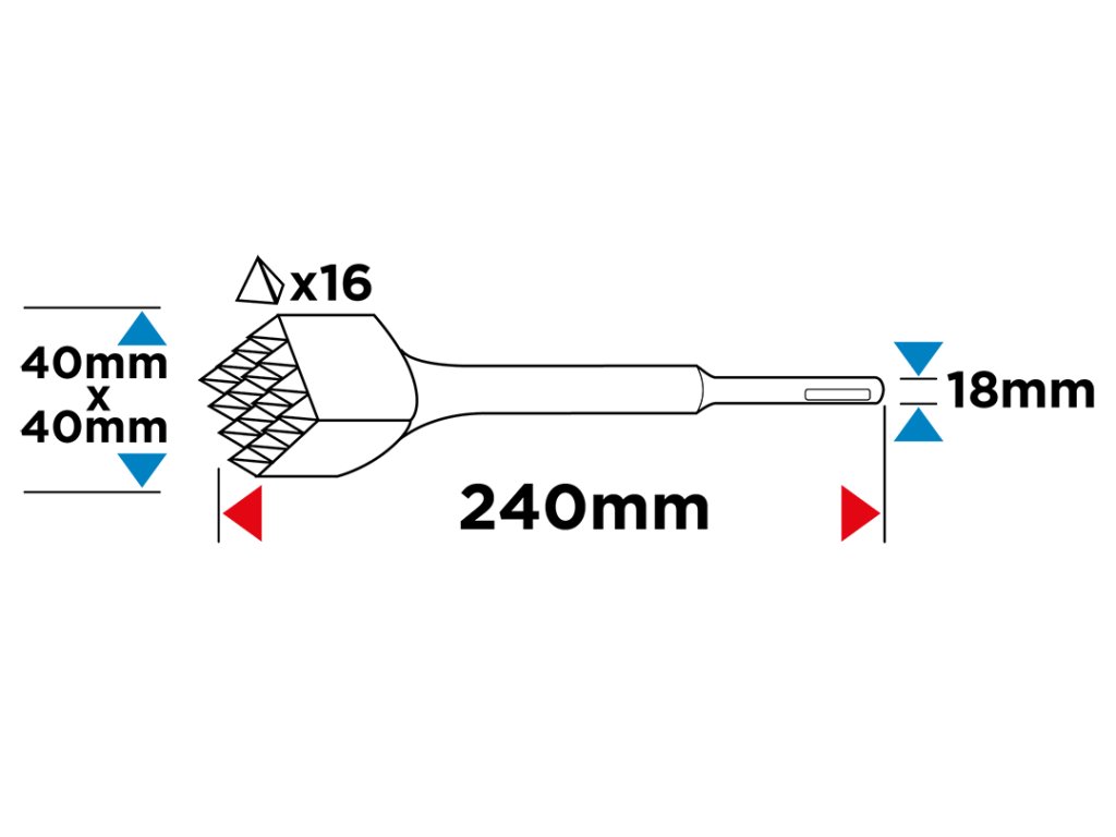 sekáč GRAPHITE SDS Max (ref. 57H552) se šířkou pracovního hrotu 40 x 40 mm a 16 zuby dává opracovávanému materiálu kamínkovou strukturu, čímž se stává drsnějším pro lepší spojení s maltou, lepidlem nebo pryskyřicí.