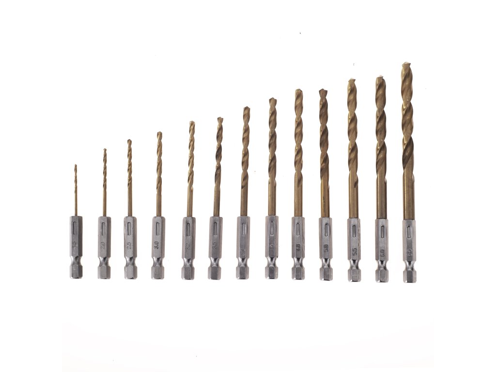 Titanové vrtáky, dvojitě broušené HSS 1,5 - 6,5 mm 13 ks BIT HEX 1/4'' TA1115