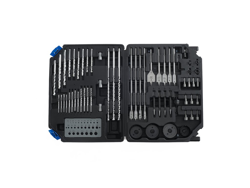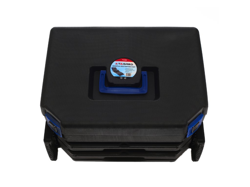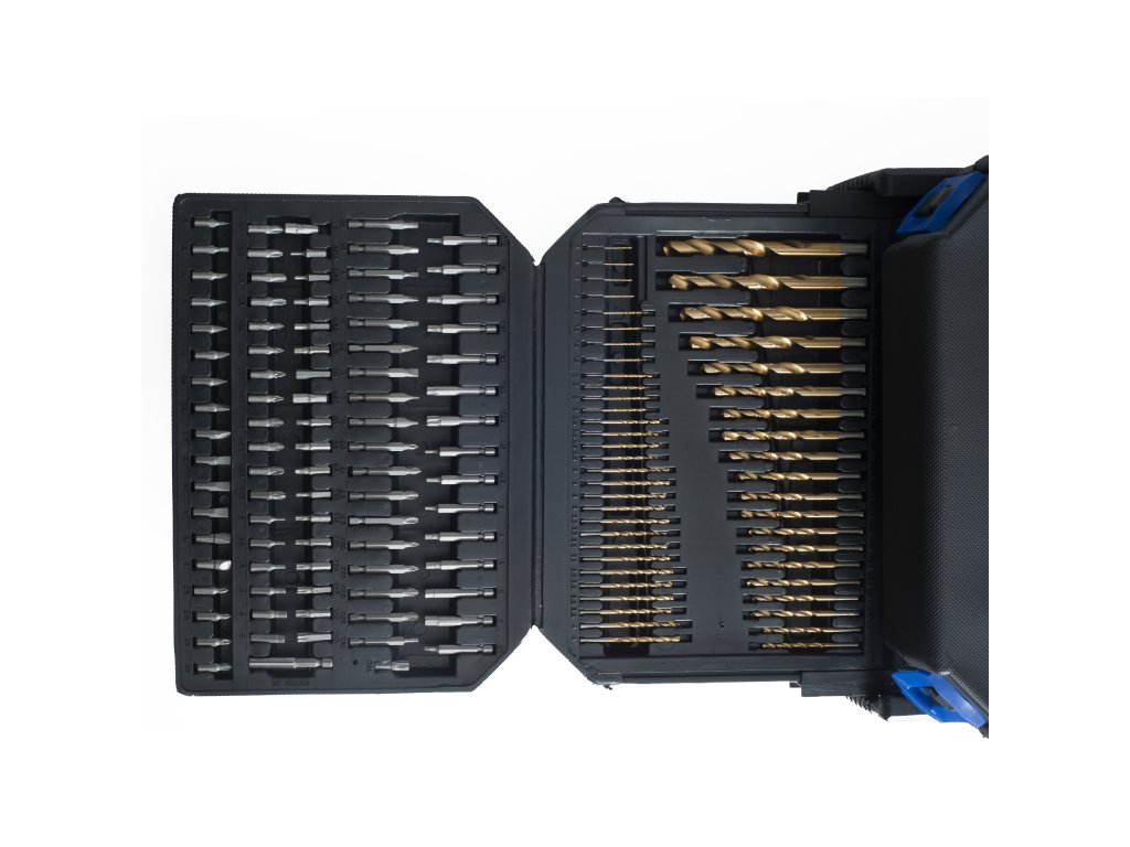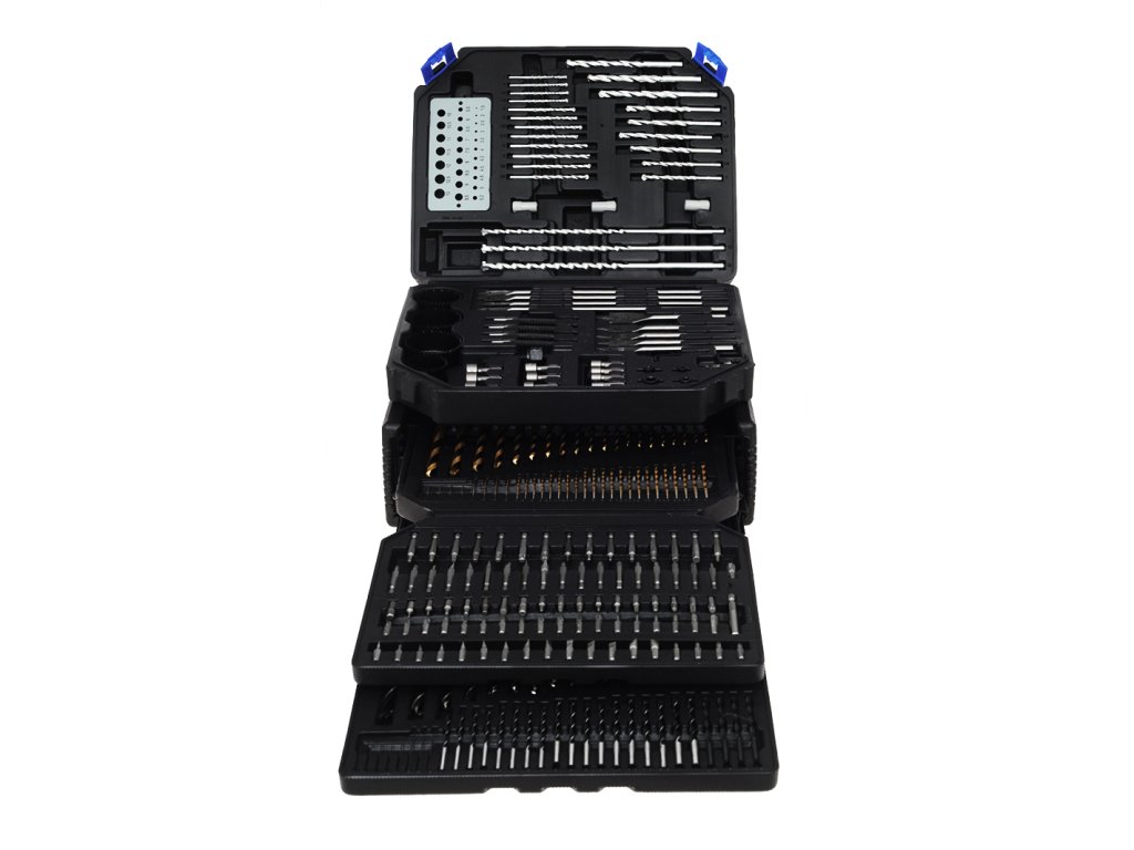 Bohatá, profesionální sada vrtáků a bitů – 300 dílů! 5 sad vrtáků do betonu, kovu a dřeva, včetně otvíračů a vrtáků s plochým hrotem, jsou uloženy v praktickém a odolném plastovém kufříku. Na šestém podnosu se nachází speciální sada různých bitů do šroubováků.
