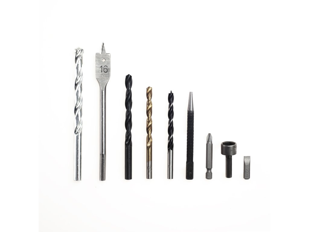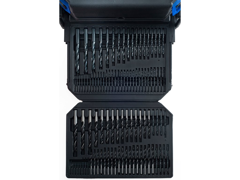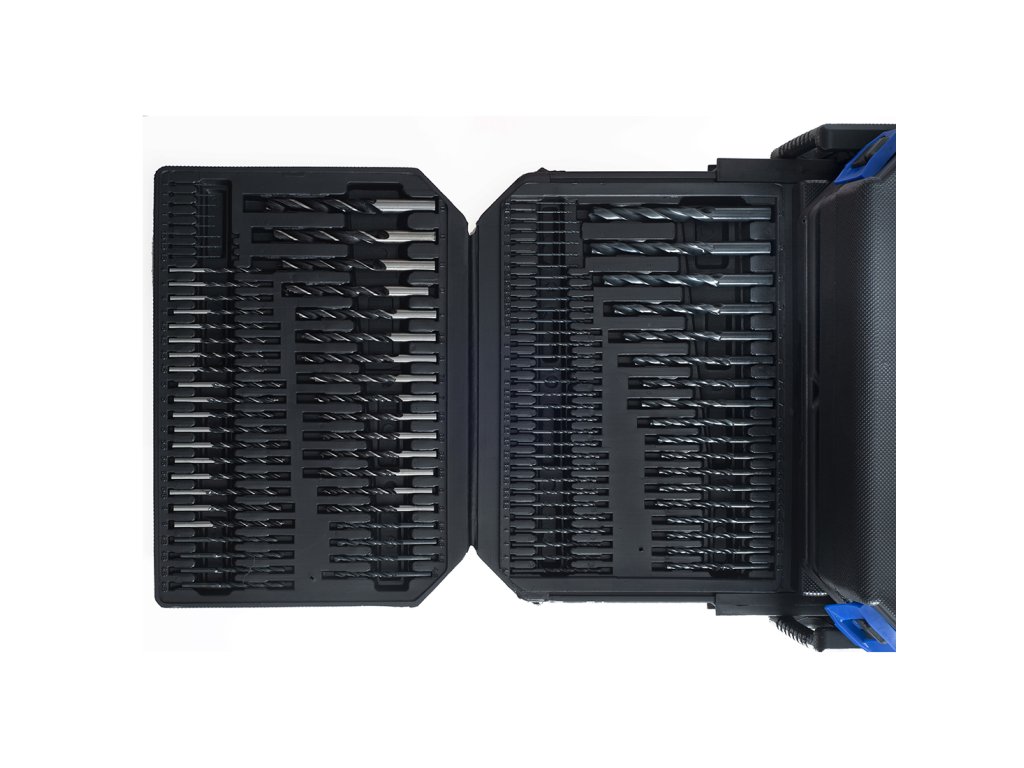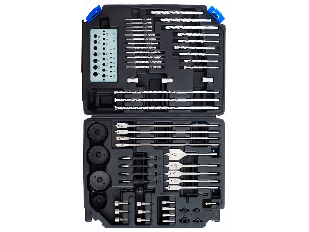 Bohatá, profesionální sada vrtáků a bitů – 300 dílů! 5 sad vrtáků do betonu, kovu a dřeva, včetně otvíračů a vrtáků s plochým hrotem, jsou uloženy v praktickém a odolném plastovém kufříku. Na šestém podnosu se nachází speciální sada různých bitů do šroubováků.