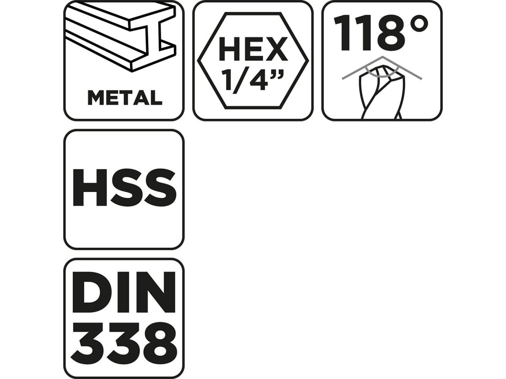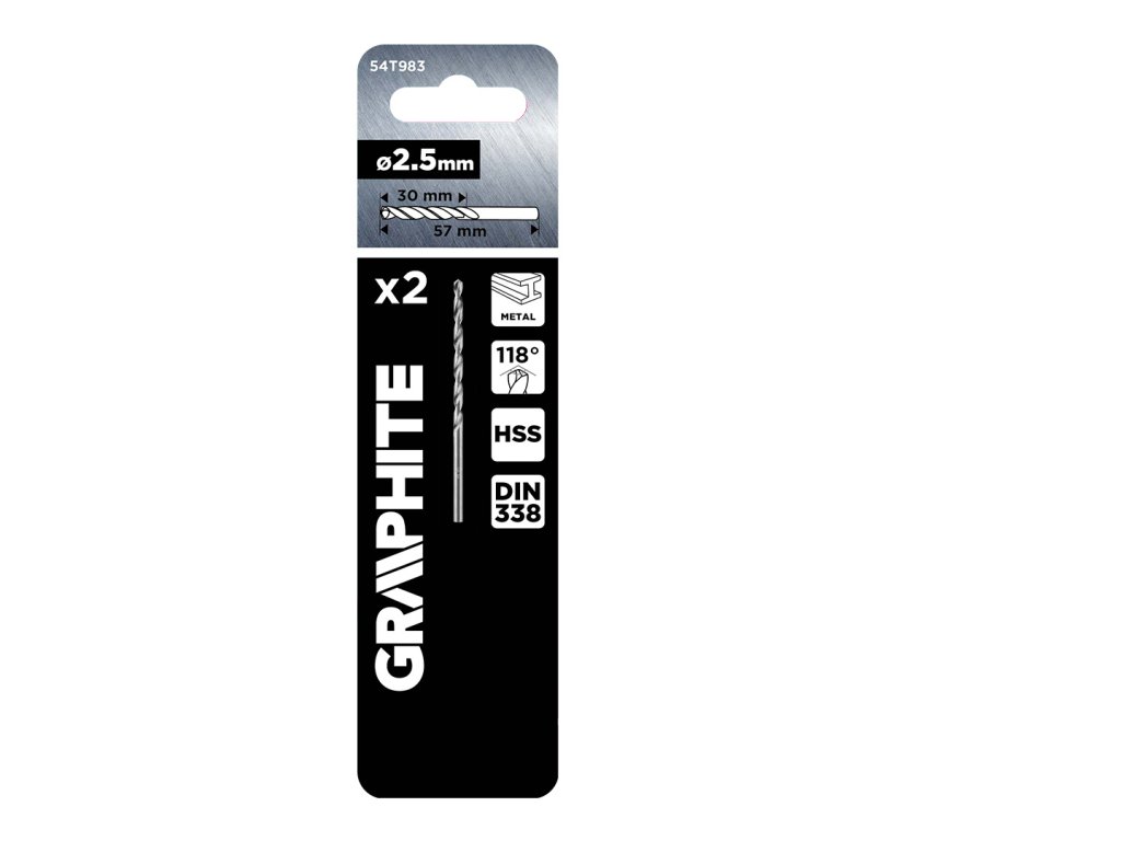 Vrtáky do kovu HSS, 2,5 mm, 2 ks. 54T983 od GRAPHITE je sada 2 kusů vrtáků určených pro práci s kovem. Jeden kus má průměr 2,5 mm, celkovou délku 57 mm a pracovní délku 30 mm. Úhel hrotu vrtáku GRAPHITE je 118 stupňů. Nástroje jsou v souladu s normou DIN 338 a budou užitečné při amatérských aplikacích.