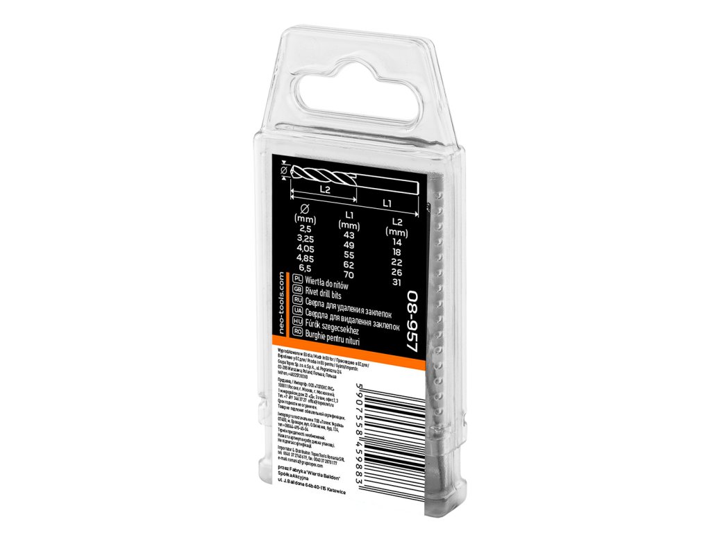 Sada specializovaných vrtáků na vystružování samořezných nýtů NEO (ref. 08-957) byla vytvořena ve spolupráci s Baildon Drill Factory S.A. v Katovicích. Vrtáky jsou vyrobeny z vysoce uhlíkové HSS. Určeno pro vystružování nýtů, vrtání do plechů, hliníku, mědi a plastů. Sada obsahuje vrtáky o průměrech: 2,5, 3,25, 4,05, 4,85, 6,50 mm, s ostřením 118 stupňů a korekcí čepele typu "C", jejíž výhodou je správné centrování, menší přítlačná síla a oddělování třísek, což vede k lepšímu odstraňování. Mají válcové sklíčidlo. Produkt, který je ideální pro garáže, karosárny a další. Opakovaně testovány v garáži NEO, aby splnily očekávání profesionálů a automobilových nadšenců.