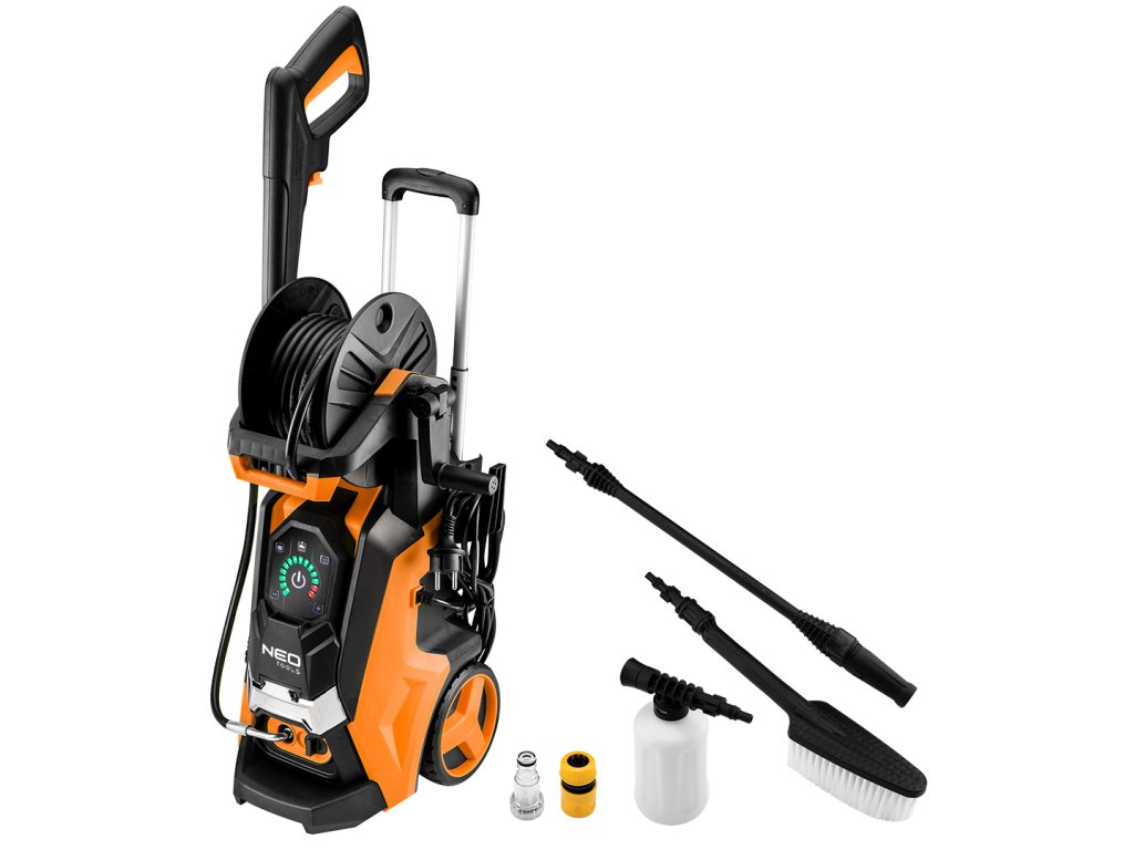 Tlaková myčka 2000 W, tlak 100 barů (max. 150 barů) 04-705 od společnosti NEO je konkurenční zařízení, které najde uplatnění v každé domácnosti, garáži, dílně nebo na zahradě. Vyznačuje se maximálním tlakem 150 barů a průtokem vody 6 l za minutu. Má dlouhou, 5 metrovou vysokotlakou hadici na bubnu, která usnadňuje a urychluje práci. Myčka se dodává také se sadou příslušenství včetně nádržky na prací prostředek, držáku na vybavení, kartáče a přípojky na přívod vody s filtrem.