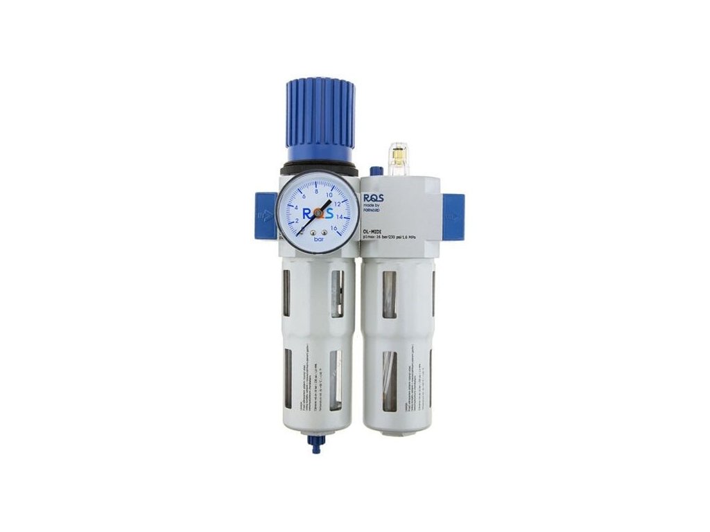 Dvoudílná sada pro přípravu vzduchu RECTUS 1/2". Sada obsahuje filtr s regulátorem i maznici.