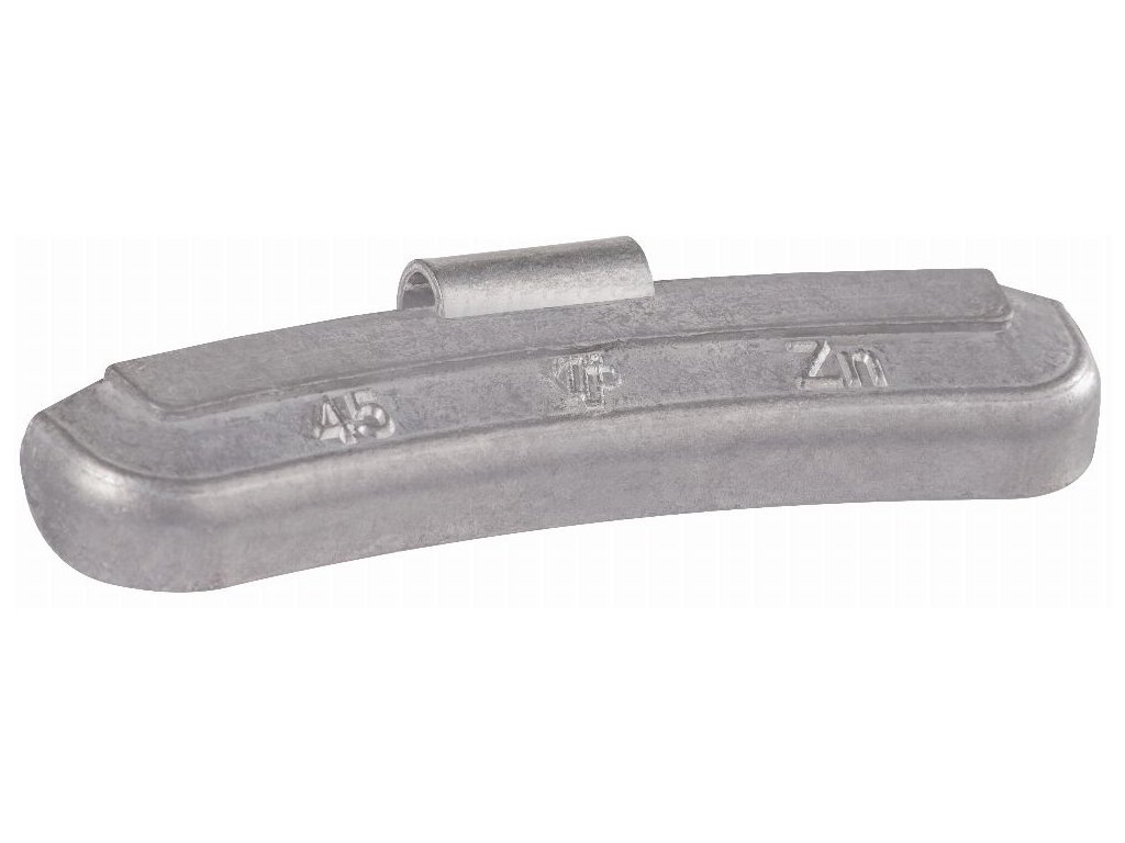 Material: zinc Protective coating: none Type: knock-on Shape: rounded Barva: stříbrná Total weight of wheel weight: 45 g Package weight: 2.25 kg Pieces per package: 50" Country of manufacture: Poland Catalogue index: 0