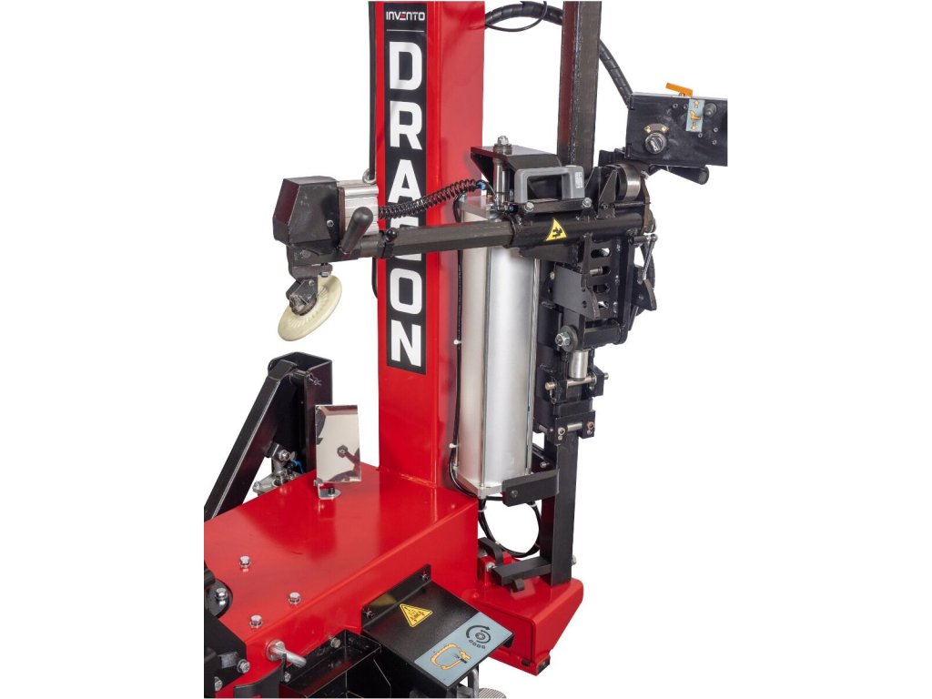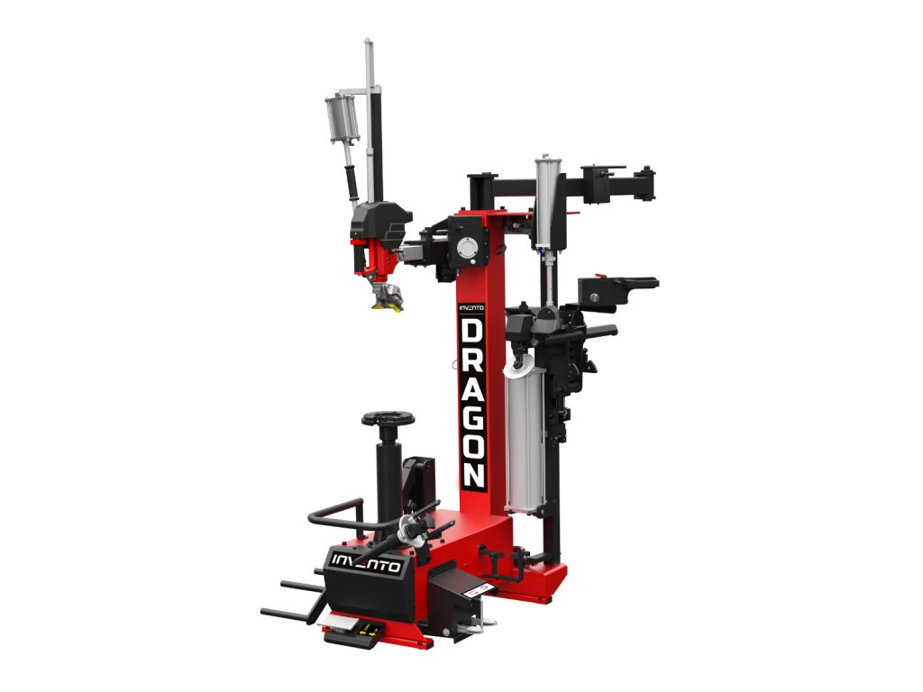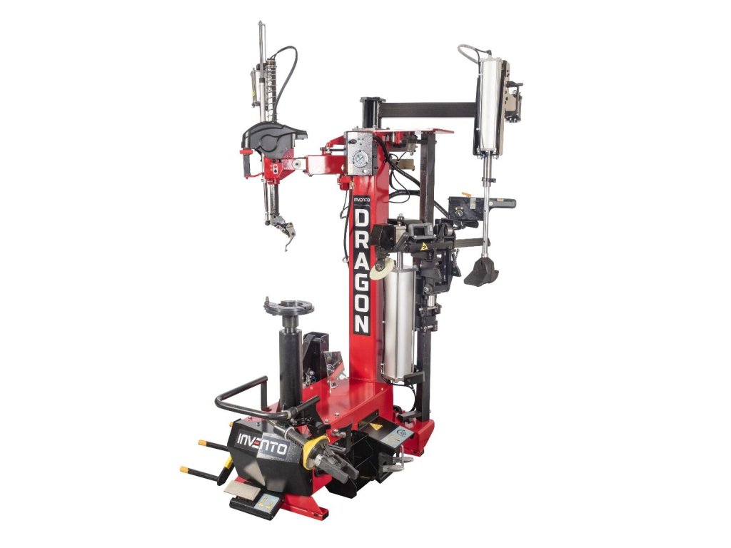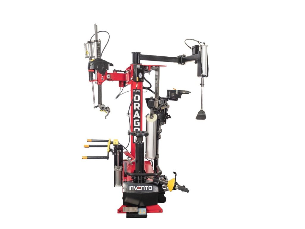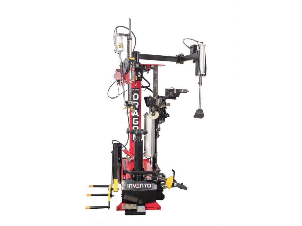 INVENTO DRAGON - Automatická zouvačka pneumatik pro osobní automobily s pomocným ramenem, LeverLess systém bez tření, centrální upínání, integrovaný zdvih kol a pohon s motorem MI (MotoInverter) umožňující plynulou regulaci rychlosti.