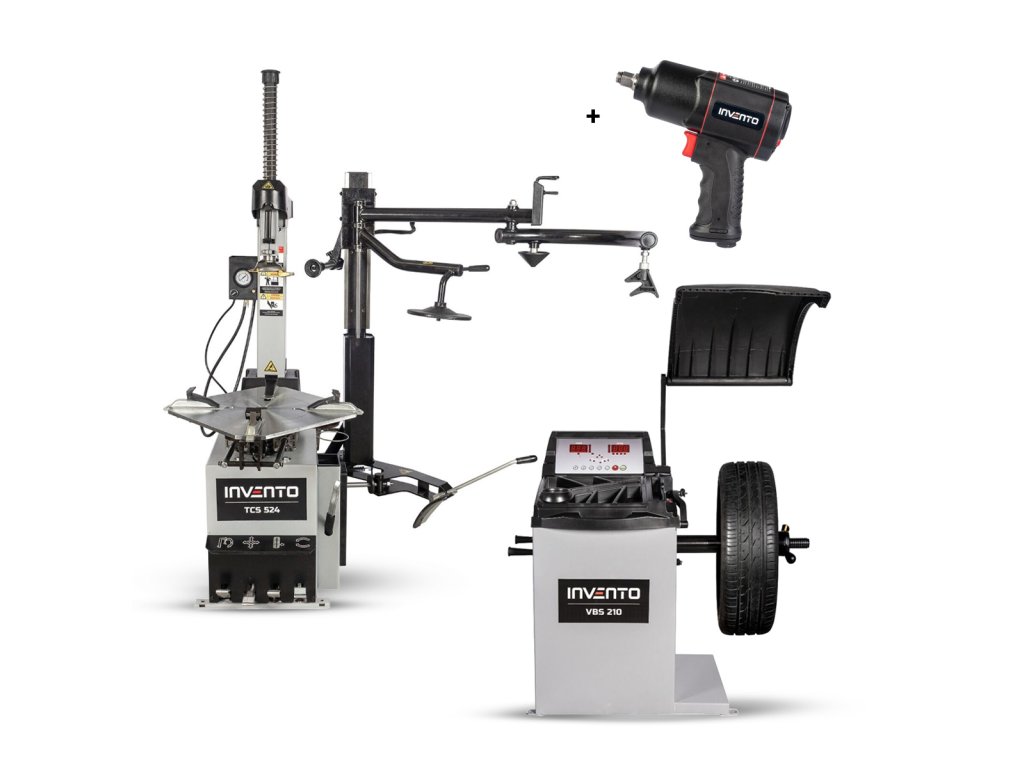 Kompletní profesionální vybavení pro autoservis nebo pneuservis. Tato sada obsahuje pokročilou vyvažovačku kol INVENTO VBS 210, výkonnou přezouvačku INVENTO TCS 524 2V HA s pomocným ramenem a silný pneumatický rázový utahovák INVENTO 1/2" Twin-Hammer s maximálním točivým momentem 1600 Nm. Perfektní řešení pro rychlou a efektivní výměnu pneumatik osobních a dodávkových vozidel.